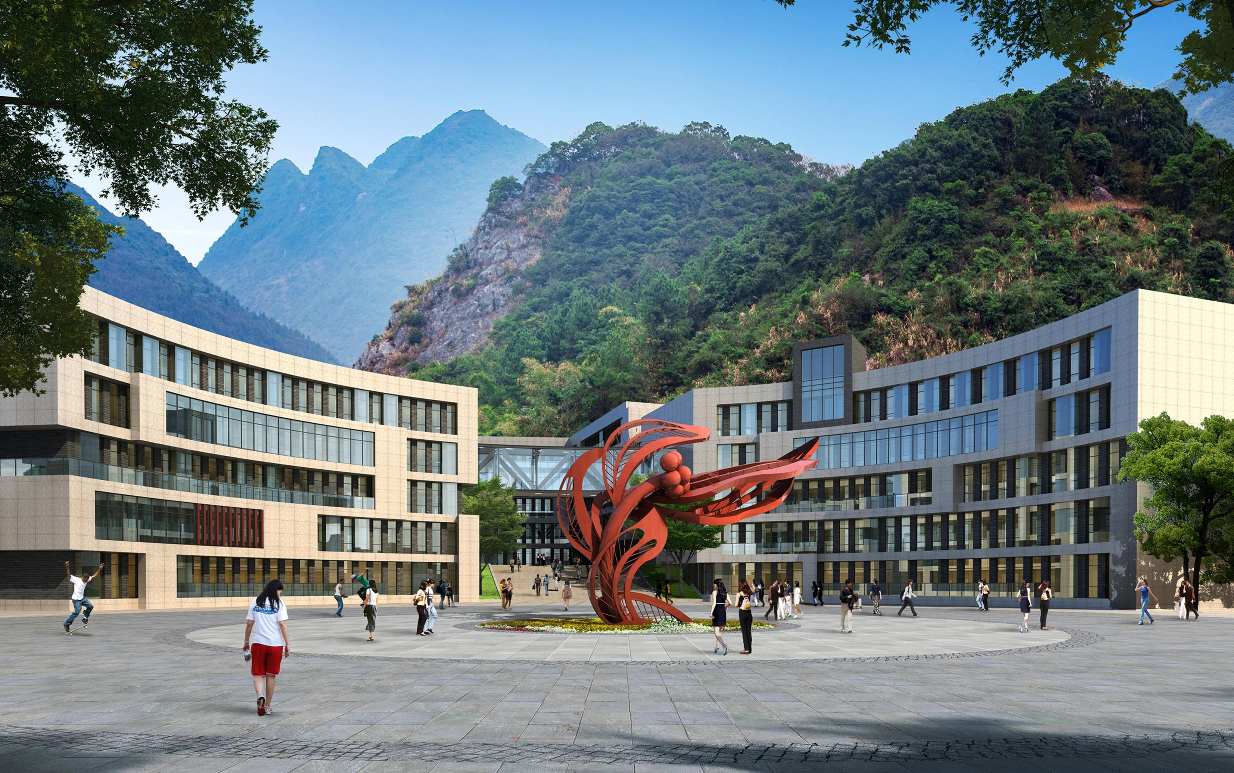 Hengshui no. 1 middle school liupanshui branch is located in hongqiao new district, liupanshui city, guizhou province, close to fengliang road and huanxian no.1 line. The overall architectural style of the project is modern, with white and gray as the main colors. Through the height of the body before and after scattered, highlight the campus active and lively style. In order to fully explore the environmental characteristics and cultural connotation of the campus, the project USES sculptures, pillars, reliefs, signage and other environmental pieces to strengthen the campus cultural information by combining different architectural Spaces. In the building facade also combined with the characteristics of traditional campus culture to create belongs toUnique campus architecture in liupanshui.