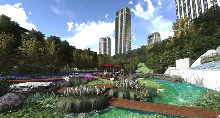 The project uses terrain for layout a heart-shaped curve path that runs through the whole land, along the road which runs through north to south, we set the third park, which is linked to the entire site, and there were two planning mountain parks in the land, ultimately formed the concept of “three parks”, that realize the design concept of mutual integration between human and parks truly. While, the third park will also be linked with business area, due to the presence of the park which has a good role in making popular gathering, that will making a very good atmosphere of business.