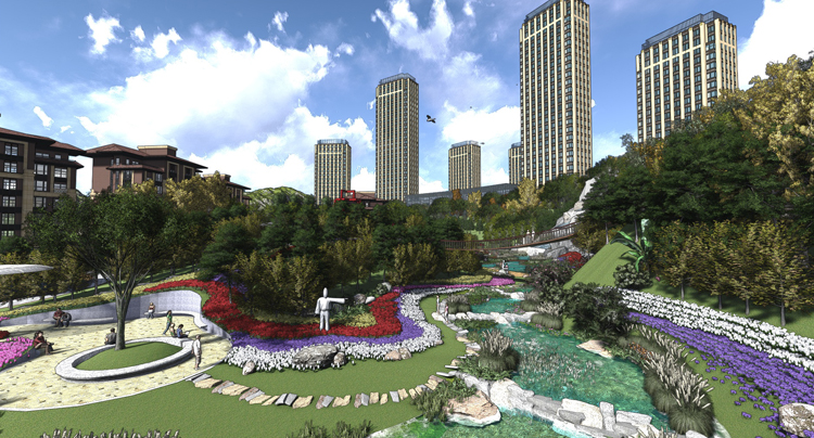 The land of project is shaped in elongated strip,which is divided into three sections by two roads crossing the entire land space, each region has a good traffic conditions.Because the residential area which have a large area, close to the road, we use axis and the squares to link with the residential entrance and outside world,to form a plurality of transparent view corridors and landscape amorous feelings avenue.The whole design mainly use poly line to organize space,use the modern style to reflect the simplicity and fashion sense of site,while,interspersed rounded square as a landscape nodes. In premise of respecting the original terrain and natural resources,we have a development and utilization of water bodies,which water features throughout the site, improving the local micro-climate, at the same time meeting requirements of the everyday needs of water-based leisure for people.