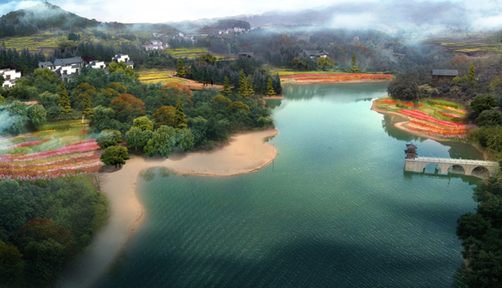 according to the characteristics of the terrain and resources , the design is inspired by the mountains, water systems, woodlands and idyllic areas, emphasiz the beauty of the natural venation, make the modern landscape art through the natural skill to reproduce the beauty of nature, artificial beauty, and pastoral beauty. It’s planning structure is one ribbon, three core, four groups.