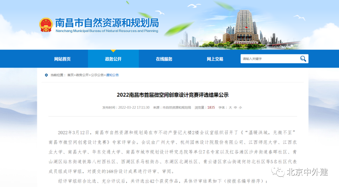 2022年1月10日,在南昌市自然資源和規劃局發布了《“溫暖洪城,無微不至”南昌市微空間創意設計競賽》的消息后,我院積極組織設計師參與其中。設計競賽專家評審會于2022年3月12日,在南昌市自然資源和規劃局拉開帷幕。評審專家對提交的168份設計成果進行嚴格的評審、審閱。