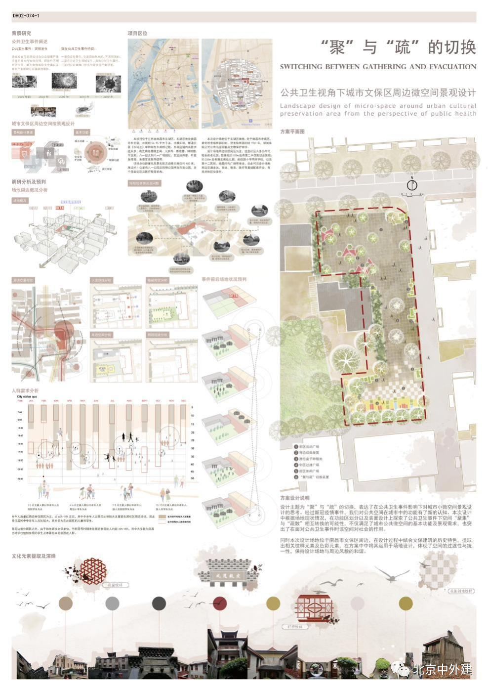 此設計主題為 “聚”與“疏”的切換,表達了在公共衛生事件影響下對城市小微空間景觀設計的思考。經過新冠疫情事件,我們對公共空間在城市中的功能有了新的認知。本次設計中根據場地現狀情況,在功能區劃分以及裝置設計上探索了公共衛生事件下空間 “聚集”與“疏散”相互轉換的可能性,不僅滿足了城市公共微空間的基本功能及景觀需求,也突出了在面對公共衛生事件時該空間對社會的作用。同時本次設計場地位于南昌市文保區周邊,在設計過程中結合文保建筑的歷史特色,提取出相關紋樣元素及色彩元素,在方案中中將其運用于場地設計,體現了空間的過渡性與統一性,保持設計場地與周邊風貌的和諧。