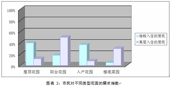 根據調查統計結果顯示,市民對不同類型花園的需求存在差異。不同的年齡階段、文化背景、職業類型、收入水平以及居住模式將直接或間接地影響著市民對小花園的向往程度。如在高密度的城市居住區,由于條件限制,從事花園活動的人數有限。從所了解的家庭中發現,有62%左右的家庭從事小花園活動,有28%的家庭若有可能將從事這一活動,10%的家庭不感興趣。相對來說,獨棟住戶較高層住戶樂于享受“閑暇園藝”。文化素質高、收入水平高,尤其是中年組市民較喜愛從事園藝活動。大多數市民對花園的需求內容主要為休閑娛樂和觀賞實用,對于小花園的理想面積、設計風格等無苛刻要求。大部分人希望面積越大越好,不太在意中式、西式、現代風格之區別。通常要求小花園面積與建筑和諧,看起來美麗舒適,設計風格主要趨向于個人喜好,與整體裝修協調。也考慮到與周圍環境的和諧、植物的配植、花園的采光、還有個人對花草的好惡、對花園建設能夠投入的精力比例等。總之,“因地制宜”的設計觀在城市小花園的設計上體現的很明顯。在未來城市發展中,小花園將倍受市民青睞。