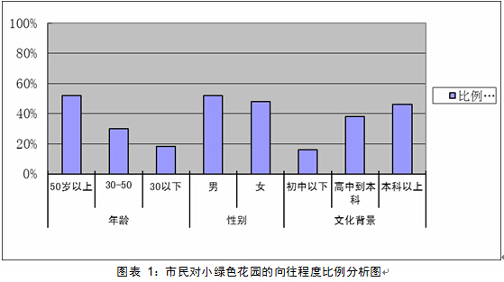 2012年1月至今,用大半年的時間對城市綠色花園的設計現狀做了深入詳實的調查研究。調查人數雖然有限,調查人員種類卻覆蓋社會民眾整體,具有普遍性和代表性。調查首先對不同年齡、性別、文化背景的人群進行了全面分析。被調查對象中,年齡最小的17歲,年齡最大的80歲,文化程度有小學、中學、高中、中專、本科、碩士、博士,職業種類有教師、文化工作者、公務員、工人、白領、個體戶、自由職業者以及設計專業人士、在校大學生等。