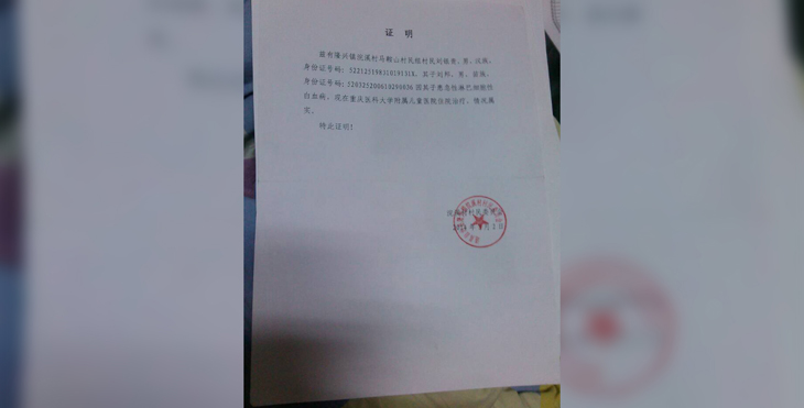 劉幫,男,8歲, 520325200610290036,貴州省遵義市道真仡佬族苗族自治縣新城社區(qū)370棟7樓。劉邦小朋友于2013年2月突感不適,當(dāng)?shù)蒯t(yī)療有限,查不出病因,于2014年2月轉(zhuǎn)院至重慶市第三軍醫(yī)大學(xué)西南醫(yī)院,經(jīng)相關(guān)檢測(cè),發(fā)現(xiàn)劉幫是急性T細(xì)胞淋巴細(xì)胞血病L2型肝瘤溶解綜合征,俗稱的白血病。
